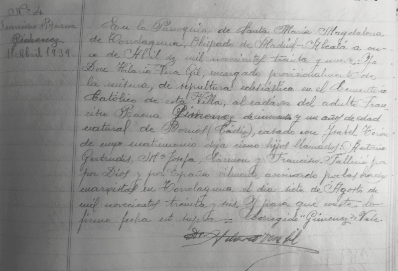 Fuente: Archivo familiar. Copia del Acta de Inhumación de Francisco Baena Jiménez, 9 de abril de 1939