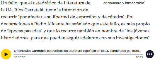 En una reciente publicación de Cadena Ser, fechada el 10 de marzo de 2025 (https://cadenaser.com/comunitat-valenciana/2025/03/10/una-juez-condena-al-catedratico-rios-carratala-a-rectificar-expresiones-contra-el-secretario-judicial-que-participo-en-el-proceso-contra-miguel-hernandez-radio-alicante/), se recogen las declaraciones del catedrático Ríos Carratalá tras la sentencia que le obliga a rectificar expresiones vertidas contra Antonio Luis Baena Tocón.