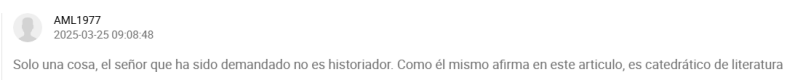 Las opiniones del Sr. Ríos Carratalá también están reflejadas en este artículo, no así las mías. Sin embargo, la cuestión no se reduce simplemente a si existe o no libertad de expresión —que, en mi opinión, sí existe—, sino al uso que algunos hacen de ella, creyéndola un derecho exclusivo, sin atender al límite fundamental de la veracidad. El Sr. Catedrático, además, demuestra tener la piel muy fina. En el juicio civil celebrado en octubre de 2024, su abogado llegó a presentar como insultos ciertas expresiones mías completamente sacadas de contexto; algunas, como “curioso personaje”, probablemente provocaron más de una sonrisa. Como catedrático de Literatura, sus propias críticas hacia otros difícilmente podrían considerarse suaves, pero se ofende cuando se le califica como “curioso personaje”, una expresión aplicada a actitudes que, simplemente, no se corresponden con las de un historiador riguroso.