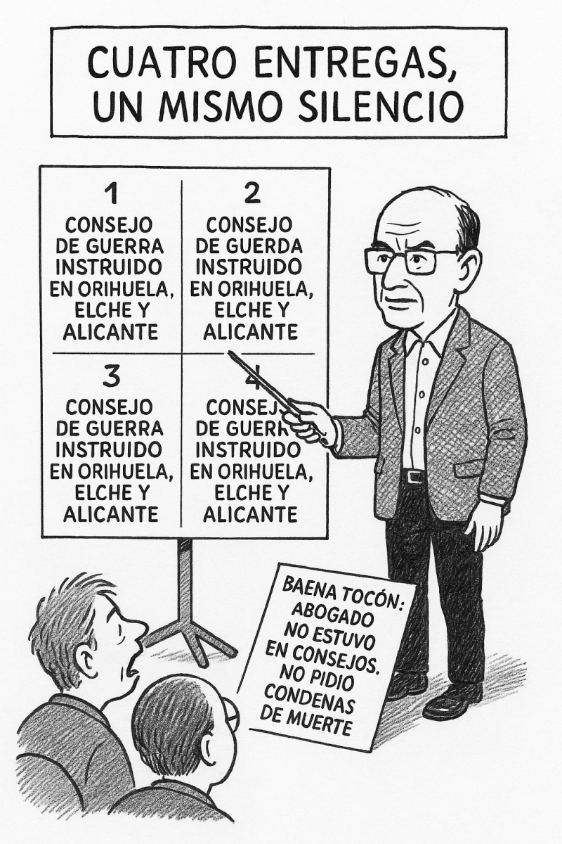 El método es ya conocido: aparentar exhaustividad, repetir datos obvios, pero nunca llegar al punto central. Porque en todo ese despliegue de información no hay ni una sola rectificación de lo que ya había dicho falsamente sobre mi padre, Antonio Luis Baena Tocón.