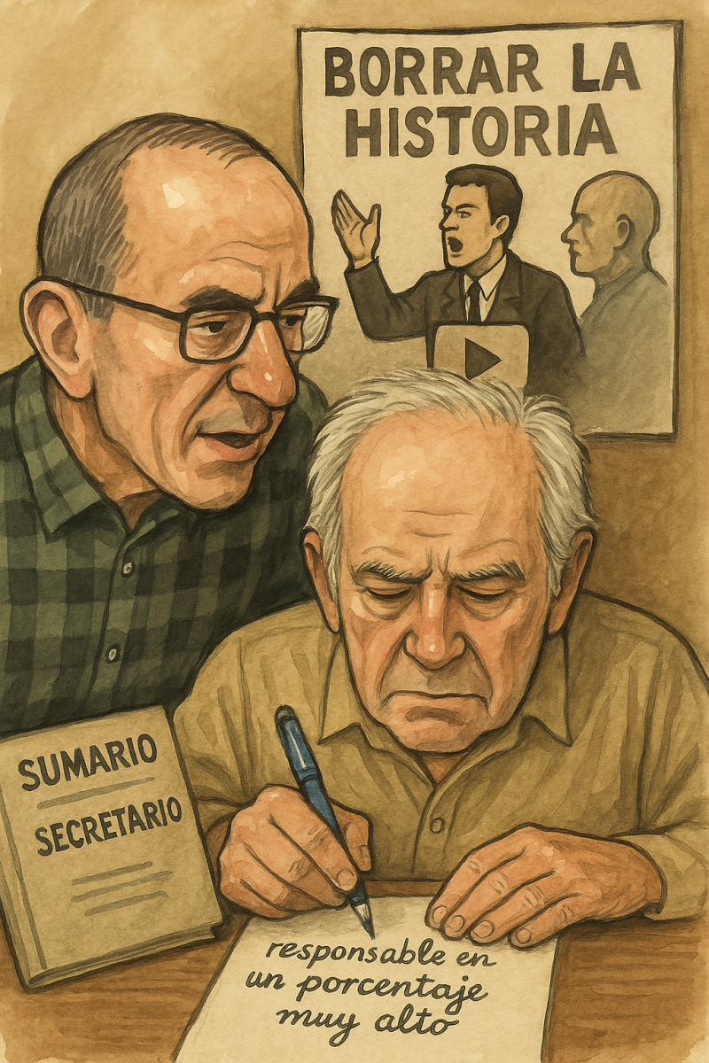 Silencio calculado: omite explicar el contexto judicial real, que demostraría que la función de mi padre fue la de secretario militar obligado y nunca la de fiscal ni juez; por tanto: sin función decisoria.
