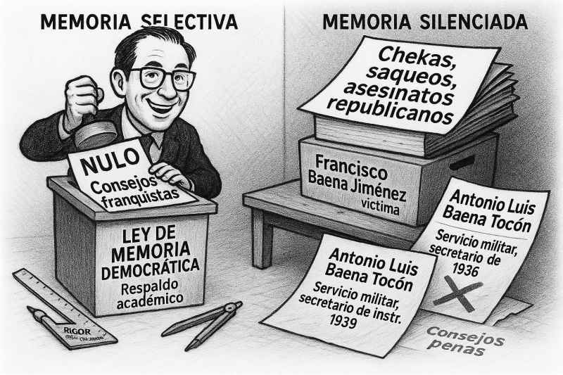El 16 de julio de 2022, el catedrático de Literatura Española de la Universidad de Alicante, Juan Antonio Ríos Carratalá, celebró La Ley de Memoria Democrática y mi trabajo. Dice investigar “con el mayor rigor posible”. Ojalá ese rigor hubiera aparecido cuando habló de mi padre: secretario del juez instructor durante su servicio militar, sin formar parte de consejos de guerra ni pedir condenas. Eso no lo invento: lo avalan documentos y resoluciones conocidas.