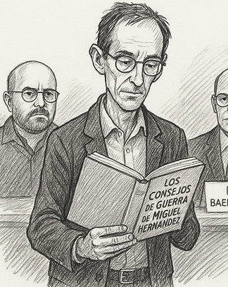 Y luego está la cuestión de Miguel Hernández. Hoy Ríos Carratalá asegura que murió “por culpa de la miseria carcelaria”. Nada que objetar: la represión franquista fue brutal e inhumana. Lo que resulta inaceptable es que, en ese juego de causas y responsabilidades, se haya llegado a colocar el nombre de Baena Tocón como si fuese culpable de esa miseria y no se diga nada del silencio del “buenismo” republicano... Y lo más grave: en otros trabajos llegó a escribir que la culpa fue de “un secretario que sabía que con sus palabras pedía la condena máxima”. ¿Quién era ese secretario? Según su relato, mi padre. Del hambre al secretario, de la cárcel a la difamación: un juego macabro de palabras que engorda bibliografías, pero no hace historia.