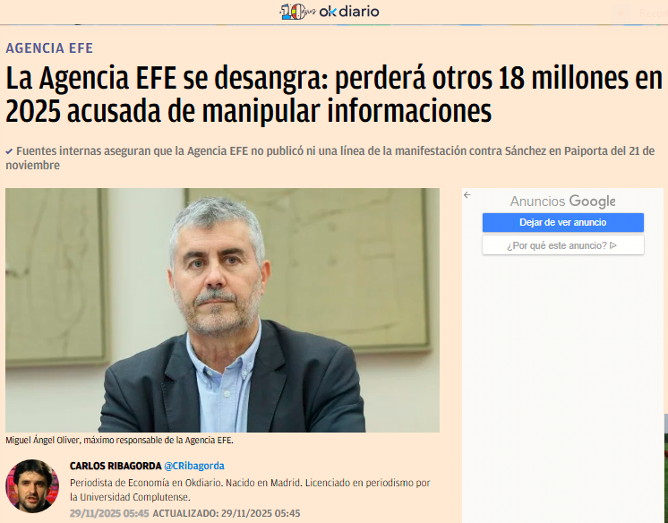 Artículo de OKDiario: “La Agencia EFE se desangra: perderá otros 18 millones en 2025 acusada de manipular informaciones” okdiario.com (https://okdiario.com/economia/agencia-efe-desangra-perdera-otros-18-millones-2025-acusada-manipular-informaciones-15846526)