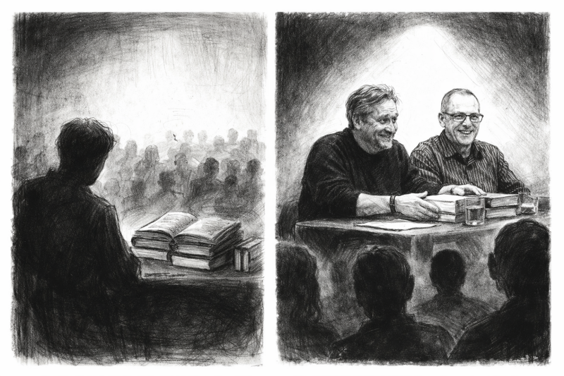 La presentación pública del libro en la librería 80 Mundos de Alicante culmina el proceso. El anuncio de una reimpresión temprana, la compañía de profesores universitarios de prestigio y la difusión de fotografías tomadas por su propio hijo configuran una escena de éxito y unanimidad.